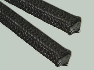 The packing is woven of graphite PTFE yarn twisted through a mixture of PTFE dispersion resins and fine graphite powder plus moderate amount of heat-resistant lubricant.